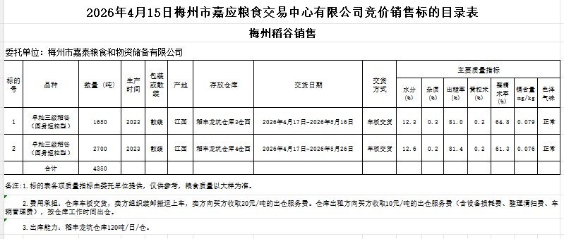 受客戶委托,梅州市嘉應(yīng)糧食交易中心有限公司定于2026年4月15日(星期三)舉辦糧食競(jìng)價(jià)交易會(huì)。梅州市嘉泰糧食和物資儲(chǔ)備有限公司擬銷售2023年產(chǎn)早秈稻谷(圓身短粒型)4350噸。