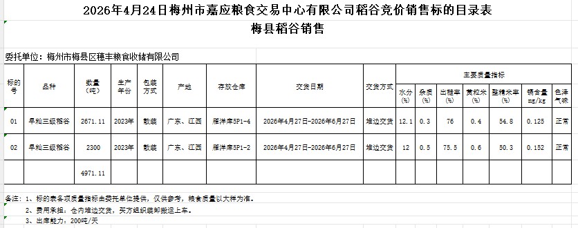 受客戶(hù)委托,梅州市嘉應(yīng)糧食交易中心有限公司定于2026年4月24日(星期五)舉辦糧食競(jìng)價(jià)交易會(huì)。梅州市梅縣區(qū)穗豐糧食收儲(chǔ)有限公司擬銷(xiāo)售2023年產(chǎn)早秈稻谷4971.11噸。