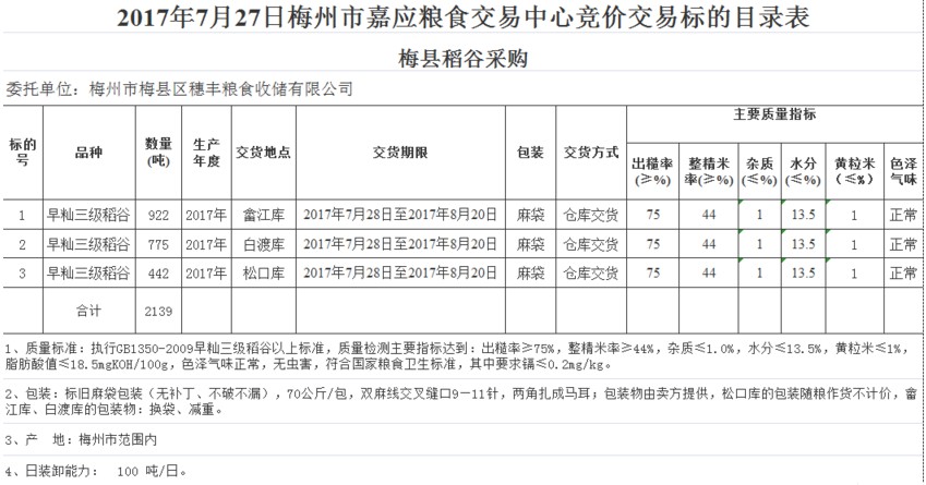 受客戶委托,梅州市嘉應糧食交易中心有限公司定于2017年7月27日舉辦糧食競價交易會,梅州市梅縣區(qū)穗豐糧食收儲有限公司擬采購2017年早秈三級稻谷共2139噸。