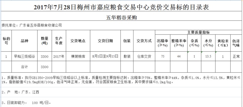 受客戶委托,梅州市嘉應糧食交易中心有限公司定于2017年7月28日舉辦糧食競價交易會,廣東省五華縣糧食收儲公司擬采購2017年早秈三級稻谷共3300噸。