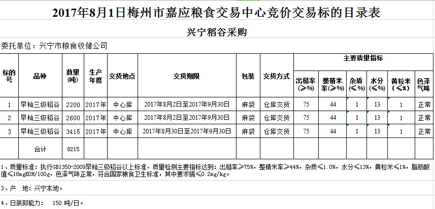受客戶委托,梅州市嘉應(yīng)糧食交易中心有限公司定于2017年8月1日舉辦糧食競價(jià)交易會(huì),興寧市糧食收儲(chǔ)公司擬采購2017年早秈三級(jí)稻谷共8215噸。
