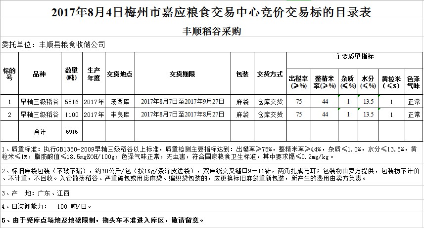 受客戶(hù)委托,梅州市嘉應(yīng)糧食交易中心有限公司定于2017年8月4日舉辦糧食競(jìng)價(jià)交易會(huì),豐順縣糧食收儲(chǔ)公司擬采購(gòu)2017年早秈三級(jí)稻谷共6916噸。