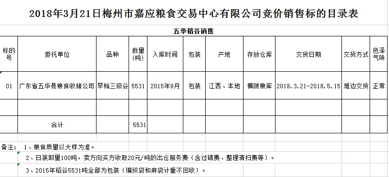 受客戶委托,梅州市嘉應糧食交易中心有限公司定于2018年3月21日(星期三)舉辦糧食競價交易會,廣東省五華縣糧食收儲公司擬銷售早秈稻5531噸。
