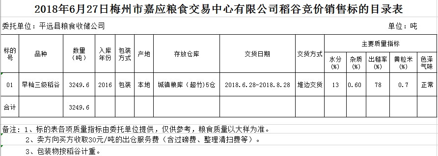 受客戶委托,梅州市嘉應(yīng)糧食交易中心有限公司定于2018年6月27日(星期三)舉辦糧食競(jìng)價(jià)交易會(huì),平遠(yuǎn)縣糧食收儲(chǔ)公司擬銷售早秈稻3249.6噸。