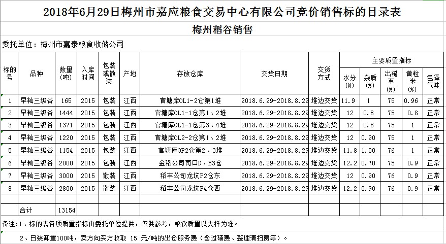 受客戶委托,梅州市嘉應(yīng)糧食交易中心有限公司定于2018年6月29日(星期五)舉辦糧食競價交易會,梅州市嘉泰糧食收儲公司擬銷售早秈稻13154噸。