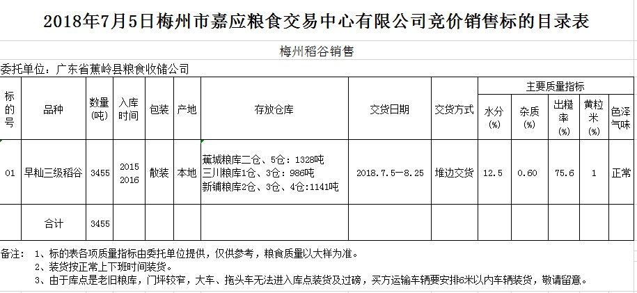 交易時(shí)間和地點(diǎn):2018年7月5日(星期四)上午10時(shí)。廣東省梅州市彬芳大道南161號(hào)梅州市糧食交易中心3樓。