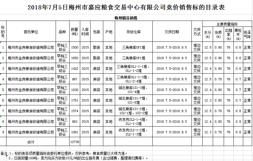 2018年7月5日梅州市金良糧食收儲有限公司稻谷銷售