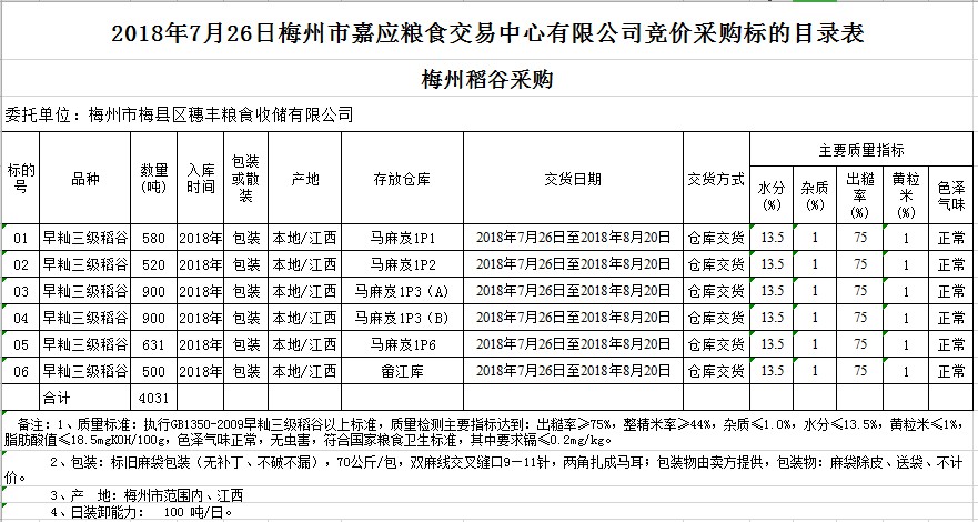 交易時(shí)間和地點(diǎn):2018年7月26日(星期四)上午10時(shí)。廣東省梅州市彬芳大道南161號(hào)梅州市糧食交易中心3樓。